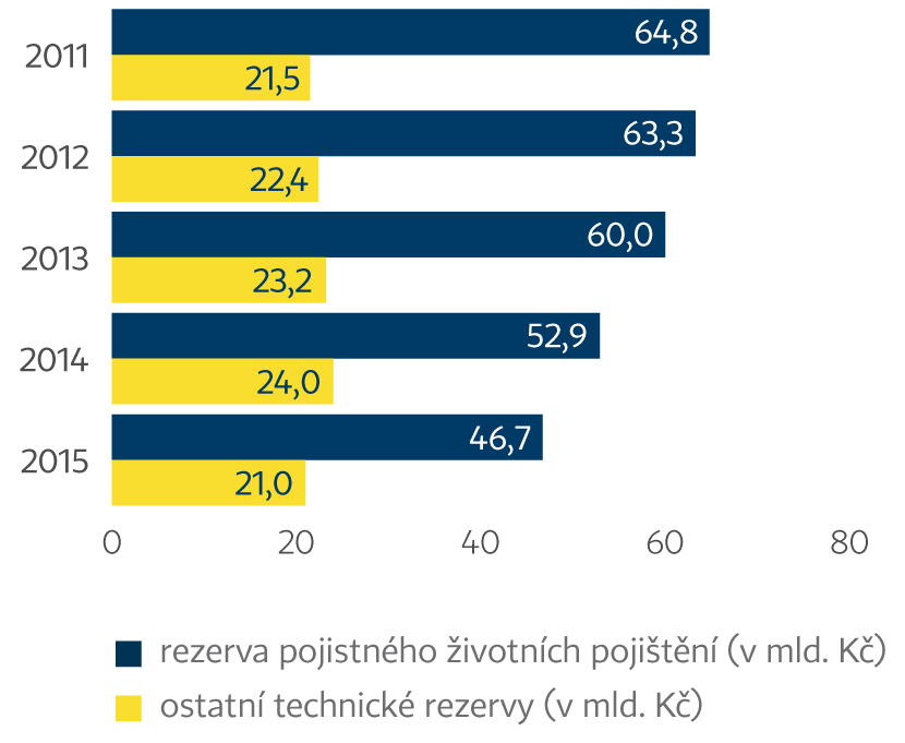 | – rezerva pojistného životních pojištění | mil. Kč | 46 658 | 52 927 | 59 966 | 63 283 | 64 826 |